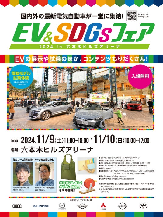 六本木ヒルズアリーナに、国産・輸入ブランドのEV(電気自動車)が大集合する「EV&SDGsフェア2024 in 六本木ヒルズアリーナ」を11月9日(土)~10日(日)に開催いたします。
