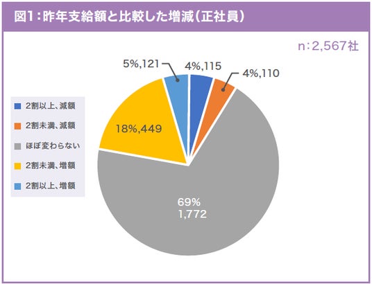 その中でも特に「飲食業・宿泊業」の企業の回答が多くあり、コロナ禍からの回復傾向が見られる結果となった。ただ一方で「2割以上、減額」と回答した企業が正社員では4%(同1%増)、パートでは2%(同1%増)となっており、原材料高騰等の影響で業況がひっ迫している企業もあるようだ。