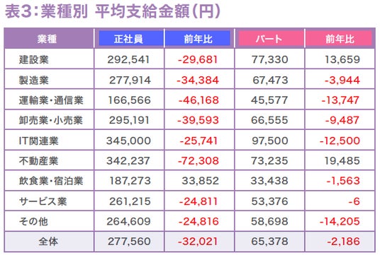 業種別にみるとIT関連業、不動産業は34万円超と高く、運輸業・通信業、飲食業・宿泊業は20万円以下となっており、最も高いIT関連業、不動産業の約半分の金額となっている。ただ正社員の平均支給額の前年比は「飲食業・宿泊業」を除くすべての業種で低下しており、厳しい状況が伺える。