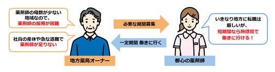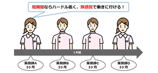 「地方移住はハードル高いが、短期間なら旅感覚で働きに行ける!」という都心薬剤師を、ローテーション勤務で繋ぐことで、地方の長期的な薬剤師不足の解消も目標にしています。