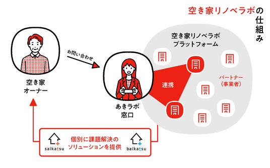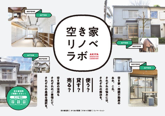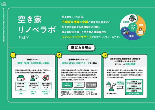 空き家リノベラボ(通称「あきラボ」)は、不動産・建築・金融の多角的な視点から、空き家を活用する最適解を無料でご提案。個々の悩みや不動産の状況に応じた空き家の課題解決を、あきラボパートナーと連携し、ワンストップでサポートするプラットフォームです。