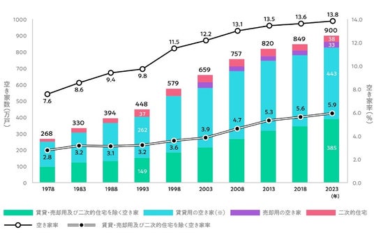 総務省統計局の令和5年「住宅・土地統計調査」の速報集計によると、2023年10月1日時点の国内の空き家数は、調査開始以来過去最多の900万戸に。1993年時点の448万戸から30年間で2倍に増加し、空き家率も過去最高の13.8%に達しています。