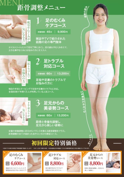 今回の西武池袋本店では、前回同様に最新の3D足型測定器を使用した足の無料測定や、オリジナルハーフインソールのお試し、西武池袋本店限定の足元からの美姿勢コースなど、ここでしか受けられない最新の距骨調整がご体験いただけます。さらに期間中は、全てのコースが初回限定の特別価格でのご提供となっておりますので、ぜひこの機会に話題の足の専門サロン「距骨サロンbioplus」をご自身の足でご体感ください。