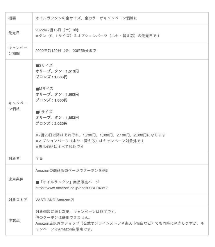 オイルランタン タン(S、Lサイズ)は、7月15日(金)の夕方ごろにAmazonに出品します。ですが、クーポンの発行は7月16日(土)0時です。