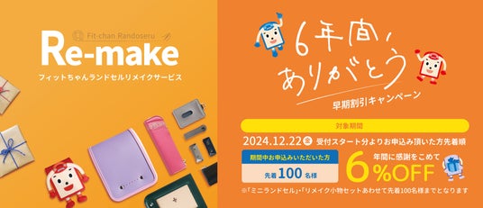 また、リメイクサービスの受付開始にあたり、ランドセルを6年間使っていただいた感謝の気持ちを込めて、先着100名様を対象に6%OFFの「6年間ありがとう!キャンペーン」もあわせて開催いたします。
