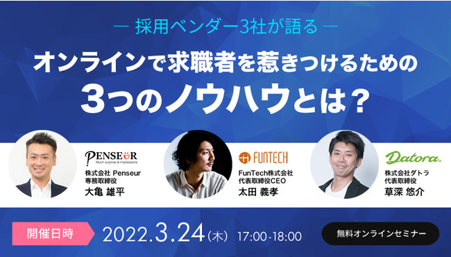 採用マーケティングATS「トルー」を運営する株式会社ダトラ(本社:大阪市中央区、代表取締役:草深悠介)は2022年3月24日(木)、株式会社パンスール、FunTech株式会社との3社共催で無料オンラインセミナーを開催いたします。