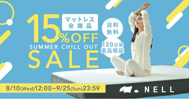 NELLは、からだの痛みに悩む方、快適な寝心地を得られたい方、そして夏の寝苦しさを少しでも解消したい方へ向け、『NELL マットレス』を少しでも手に取っていただきやすくするために「全サイズ15%OFF」となるキャンペーンを実施いたします。もちろん、セール期間中も「120日のトライアル期間」による返金・返品保証を提供いたします。まずはご自宅でじっくり『NELL マットレス』の寝心地をお試しください。