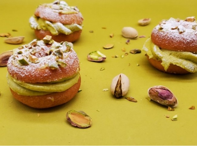 ・オリジナルのカスタードクリームにイタリア産ピスタチオクリームを加え、ドーナツの間に挟みパリブレスト風に仕上げました。食感のアクセントにピスタチオクラッシュを散りばめ、ピスタチオを堪能できるドーナツです。