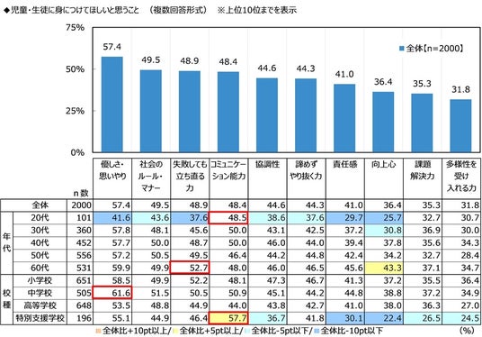 - 児童・生徒に身につけてほしいこと 1位「優しさ・思いやり」、20代では「コミュニケーション能力」が1位