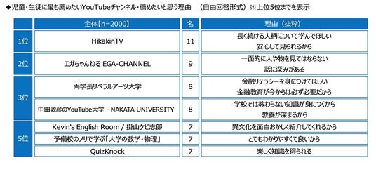 TOP3となった回答について、薦めたいと思う理由をみると、1位の「HikakinTV」では「長く続ける人柄について学んでほしい」や「安心して見られるから」、2位の「エガちゃんねる EGA-CHANNEL」では「一面的に人や物を見てはならない」や「話に深みがある」、3位の「両学長リベラルアーツ大学」では「金融リテラシーを身につけてほしい」、「中田敦彦のYouTube大学 - NAKATA UNIVERSITY」では「学校では教わらない知識が身につくから」といった回答がありました。