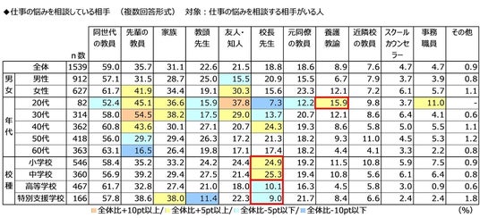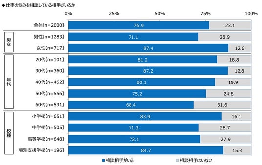 - 「仕事の悩みを相談する相手がいる」77% 女性では87%、相談する相手 1位は「同世代の教員」