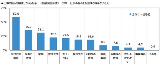 仕事の悩みを相談する相手がいる人(1,539名)に、仕事の悩みを相談している相手を聞いたところ、「同世代の教員」(59.0%)が最も高くなりました。同じ年代の教員同士ではお互いの悩みに共感しあえると考える人が多いのではないでしょうか。次いで「先輩の教員」(35.7%)、「家族」(31.1%)、「教頭先生」(22.6%)、「友人・知人」(21.5%)となりました。