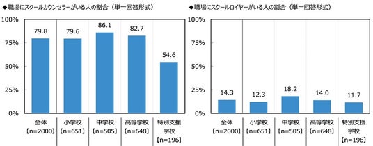 - スクールカウンセラー、スクールロイヤーの在籍率 「スクールカウンセラー」は80%、「スクールロイヤー」は14%