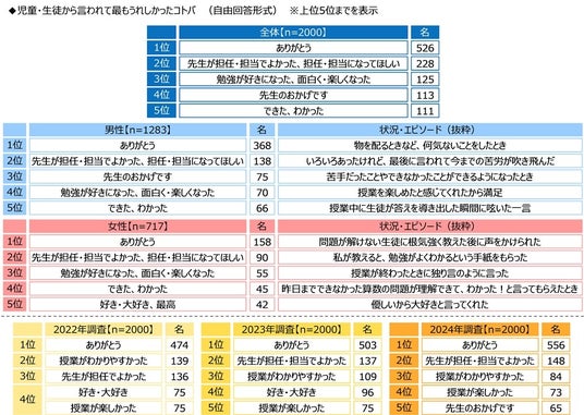 - 児童・生徒から言われて最もうれしかったコトバ 「ありがとう」がダントツ2位「先生が担任・担当でよかった、担任・担当になってほしい」3位「勉強が好きになった、面白く・楽しくなった」