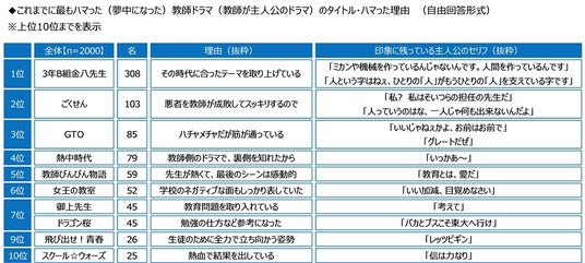 また、印象に残っている主人公のセリフでは、1位の「3年B組金八先生」の「ミカンや機械を作っているんじゃないんです。人間を作っているんです」などの不良生徒を腐ったミカンと例えられたことに反論したシーンのセリフが多く挙げられました。そのほか、2位の「ごくせん」では、「私? 私はそいつらの担任の先生だ」、3位の「GTO」では、「いいじゃねぇかよ、お前はお前で」などが挙げられました。