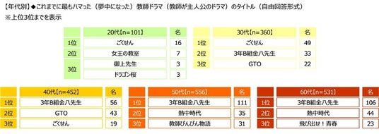 年代別にみると、20代と30代では「ごくせん」、40代以上では「3年B組金八先生」が1位となりました。
