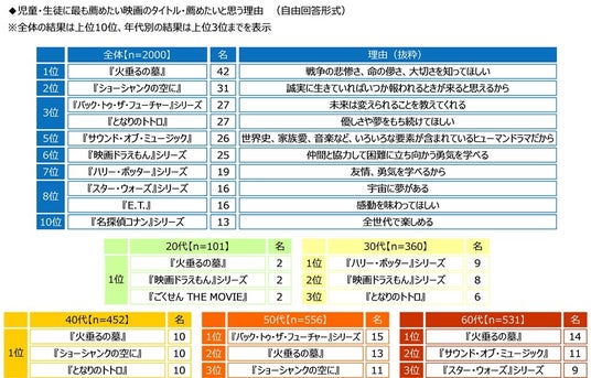 TOP3となった回答について、薦めたいと思う理由をみると、1位の「火垂るの墓」では「戦争の悲惨さ、命の儚さ、大切さを知ってほしい」、2位の「ショーシャンクの空に」では「誠実に生きていればいつか報われるときが来ると思えるから」、3位の「『バック・トゥ・ザ・フューチャー』シリーズ」では「未来は変えられることを教えてくれる」、「となりのトトロ」では「優しさや夢をもち続けてほしい」といった回答がありました。