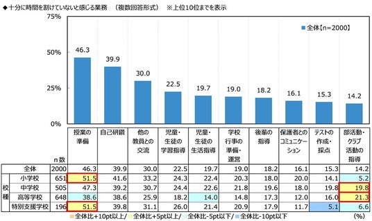 勤務先の学校種別でみると、小学校の教員、特別支援学校の教員では、「授業の準備」(いずれも51.5%)が半数を超えており、多くの人が授業準備の時間が足りないと感じていることがわかりました。また、中学校の教員、高等学校の教員では「部活動・クラブ活動の指導」(中学校19.8%、高等学校21.3%)が全体と比べて5ポイント以上高くなりました。