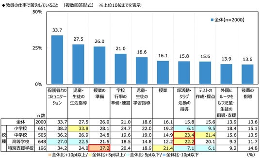 全回答者(2,000名)に、教員の仕事で苦労していることを聞いたところ、1位は「保護者とのコミュニケーション」(33.7%)となりました。次いで2位は「児童・生徒の生活指導」(27.5%)、3位は「授業の準備」(26.0%)、4位は「学校行事の準備・運営」(21.0%)、5位は「児童・生徒の学習指導」(18.6%)となりました。また、「外国にルーツをもつ児童・生徒の指導・支援」(13.9%)もTOP10に挙がりました。