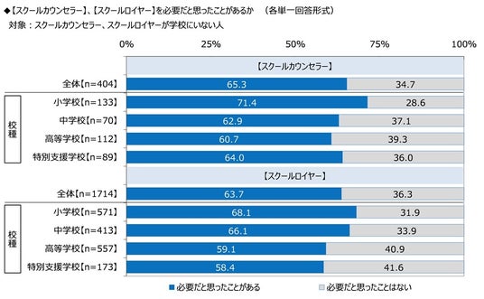- スクールカウンセラーが自身の学校にいない人の65%が「スクールカウンセラーが必要だと思ったことがある」と回答、スクールロイヤーが自身の学校にいない人では64%がスクールロイヤーの必要性を実感した経験あり