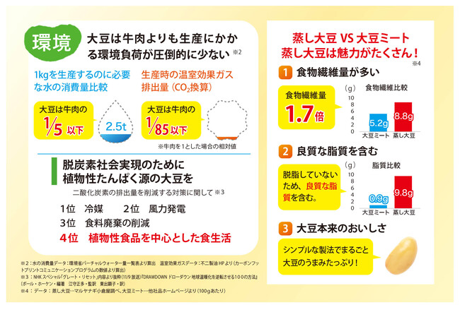 昨今、大豆ミートに代表されるプラントベースフードが注目される中で、蒸し大豆は大豆ミートと比較しても食物繊維量は1.7倍あり、大豆の良質な脂質を含んでいます。何より、水戻しなどの手間がなく開けてすぐに食べられる手軽さや、どんなお料理にも合う大豆そのもののおいしさが魅力です。