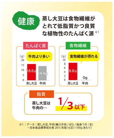 たんぱく質は牛肉と同程度、脂質は1/3以下ながら、食物繊維がしっかり摂れる蒸し大豆は、様々な健康課題を解決できる可能性を秘めています。