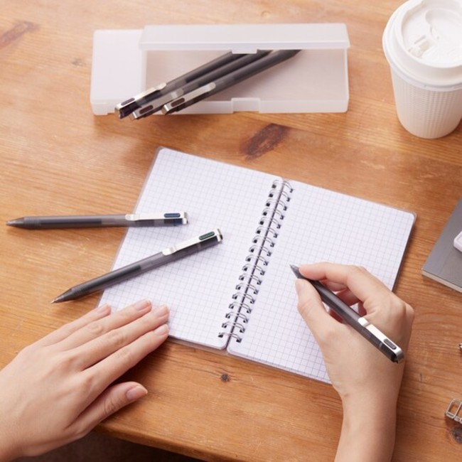 通常のラインナップは、軸色ライトグレー(ボール径0.4mm)、軸色ダークグレー(ボール径0.5mm)の2種類あり、インキ色は、ピュアブラック・ナイトブラック・モカブラック・フォレストブラック・カシスブラック・ミステリアスブラックのそれぞれ6色の黒インキをご用意しています。