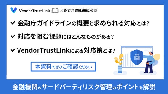 委託先リスク管理サービス「VendorTrustLink(ベンダートラストリンク)」を提供する株式会社アトミテック(本社:東京都港区、代表取締役社長:中西 康貴)は、サードパーティリスク管理にお悩みを抱えている金融機関をサポートすることを目的に、お役立ち資料「金融機関のサードパーティリスク管理」を無料公開したことをお知らせします。