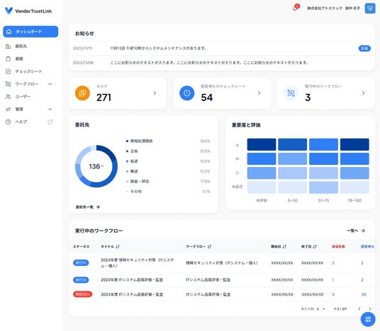 アトミテックは、委託先・取引先に関連するリスク管理を一元化し自動化するサービス「VendorTrustLink」を提供しています。委託先へのチェックシートの送信から結果の確認までの工程を自動化しており、人的コストやミスの削減に繋がるツールです。2024年10月28日(月)よりβ(ベータ)版として提供を開始しており、月3社限定で利用企業を募集。大手企業のβ版利用も始まっています。人手不足や業務効率化にお悩みのご担当者の方は、お気軽にお問い合わせください。