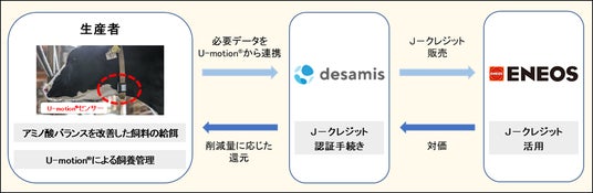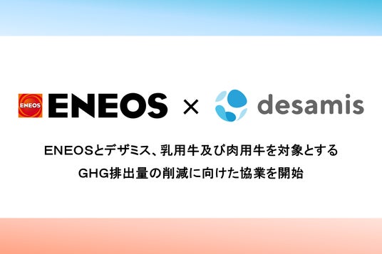 ENEOSホールディングス株式会社(社長:宮田 知秀、以下「ENEOS」)とデザミス株式会社(代表取締役:清家 浩二、以下「デザミス」)は、乳用牛と肉用牛の飼養により発生する温室効果ガス(以下「GHG」)排出量を削減するための協業を開始しました。この度、その第一歩となるJ-クレジット創出プロジェクト「クラウドデータを活用した乳用牛及び肉用牛の栄養バランス改善飼料の給餌プロジェクト」(以下「本プロジェクト」)がJ-クレジット認証委員会により承認されたことをお知らせいたします。協業に先立ち、2024年2月にENEOSはENEOSイノベーションパートナーズ合同会社(社長:長沼 亨)を通じ、デザミスに出資しています。