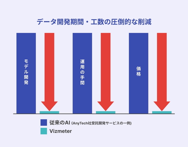 従来のAI開発・導入における常識を覆した汎用性と手軽さを実現し、AI導入のハードルを大きく下げたこの「Vizmeter」で多業種における業務プロセスの改善と効率化を支援します。