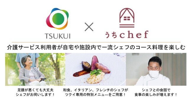 今回の業務提携では、「うちchef」に登録しているシェフが、株式会社ツクイのサービスを利用する高齢者の自宅や施設に出向いてコース料理を作ります。利用者の方々は、シェフと会話しながら一流レストランの料理を楽しむことができます。また、シェフは利用者の方々の健康状態や栄養バランスに配慮した料理を提供します。