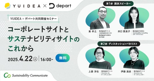 長年にわたり「理想のサステナビリティサイト」を追求してきた株式会社YUIDEAとグループ企業であるWeb制作会社の株式会社デパートの専門家が登壇。 最新の情報開示トレンドを踏まえながら、「コーポレートサイトとサステナビリティサイトの役割」と、「サステナビリティサイトのこれから」について解説します。さらに、パネルディスカッションでは、Web制作・サステナビリティ情報開示支援担当など異なる立場より、多角的な視点で「サステナビリティサイト制作の実務」について深堀りします。