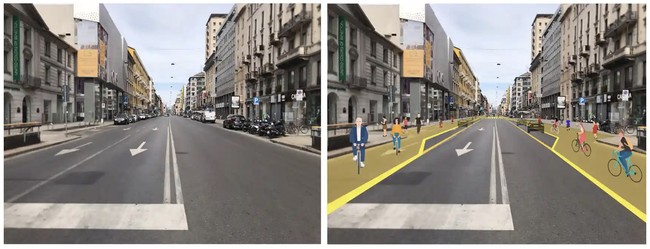 Plans for Corso Buenos Aires before and after the Strade Aperte project. Composite: PR