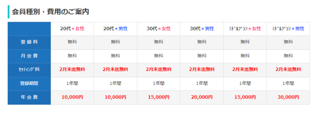 登録期間は1年間有効として、費用は各年代別・男女別(30歳以上のみ)に年会費を設定。20代では男女同額の1万円、30代・40代では1.5万円からご利用が可能です。その他、登録料・月会費・成婚料等の名目で別途、ご負担いただく費用はありません。