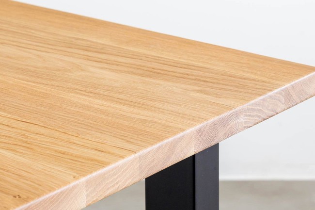今回発売する「THE TABLE / オーク」に使われているホワイトオークは、淡黄白色と表現される、癖のないナチュラルな色が特徴です。天板の塗装には、透明な「マットウレタンニス」を使用しているため、オーク本来の自然な色味を楽しむことができます。