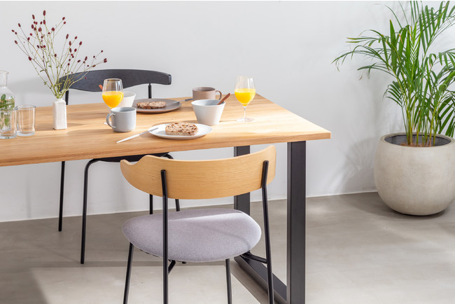 アイアン脚とのコーディネートにより、オークの素朴な風合いを程よく引き締めています。鉄脚にすることでナチュラルでありながらもスタイリッシュ+モダンな印象に仕上げています。