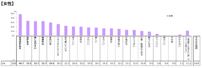 ・女性は、「清潔感がある」48.7%、「品がある」33.5%、「親しみやすい」「健康的な」32.7%、「きれいな」29.6%がトップ5。