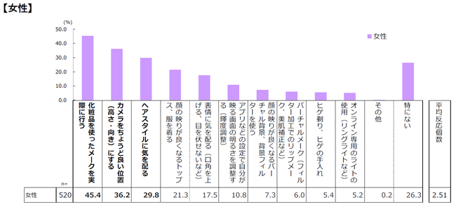 ・女性は、「メーク」45.4%、「カメラをちょうど良い位置にする」36.2%、「ヘアスタイルに気を配る」29.8%がトップ3。