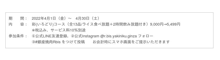 今年3月8日にオープンした銀座一丁目の戸建て焼肉レストラン「銀座 焼肉R.bis(アール・ドット・ビス)」では、オープン記念キャンペーン第2弾として、4月1日~4月30日の期間中は、一番人気の「彩(いろどり)コース(全13品/ライス食べ放題+2時間飲み放題付き)」 通常価格9,000円を5,499円でご提供します。“五感で楽しむ美しい焼肉”を追求した、趣向を凝らした焼肉コースを今だけお得にお楽しみいただけます。どうぞお見逃しなく。