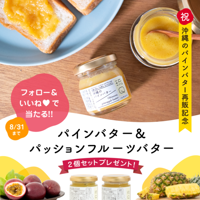 沖縄発の食品ブランド「琉Q(ルキュー)」(運営:GUILD OKINAWA株式会社/デジマール株式会社)が、当ブランドの人気商品「沖縄のパインバター」再販スタートを記念し、Instagramにて合計10名様に人気商品が当たるフォロー&いいねキャンペーンを2022年8月31日(水)まで開催中です。