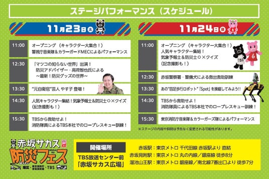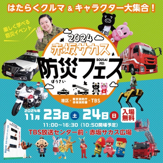 TBSと港区は、昨年2日間で約1万3000人の来場者を記録した大人気イベント「赤坂サカス防災フェス」を今年も11月23日(土・祝)~24日(日)の2日間にわたって、TBS放送センター前の赤坂サカス広場で開催します。