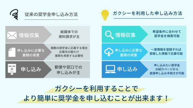 ガクシーを利用することにより、奨学金を必要としている学生・保護者のメリットとして、これまでの煩雑な奨学金の申し込み手続きを簡単に行うことができます。