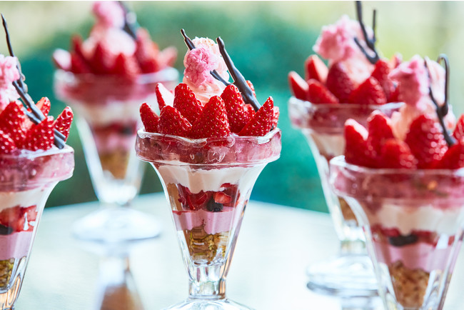 苺をふんだんに使用した期間限定の春のパフェ。淡いピンク色の桜クリームの下にほんのり塩気を感じるミルクソルベと花びら入りの桜ゼリーが入っていて、その下にはミルクプリン、ベリー、グリオットチェリーのムース、ピスタチオ入りのホワイトチョコクランチが層になっていて、食べ進めるたびに色んな味や食感を楽しめるようになっています。