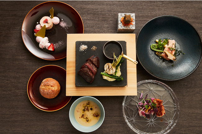 「リバーサイドキッチン&バー」では、近隣で収穫される野菜や魚、また相州牛などのお肉に至るまでこだわりの食材を使用した絶品の薪グリル料理をご用意しています。「Sakuraで彩る旬の食材のコースディナー」は、コース全体で春をイメージした全6品の特別ディナーとなっています。「薪で火を入れた海老のマリネ トマトとイチゴ、レモングラスの風味 ビーツのモッツアレラアイス」は、桜のようなピンク色のフレッシュモッツアレラチーズのアイスにレモングラスとセミドライトマトのディップで和えた香ばしい海老を盛り付け、春をイメージしたサラダを添えた前菜です。スープは箱根の清らかな水を使用した手作り豆腐とホワイトアスパラを使った「大豆と辻国豆ふの冷たいスープ」。「ミディアムなマスのコンフィとアワビ 春野菜のバルサミック」は、低温調理でミディアムレアに仕上げたくぬぎマスに、フリットしたみじん切りのフキノトウにバルサミコとディジョンマスタードを和えたソースが絶品の魚料理です。そして、ホテル自慢の薪グリルで芳醇な香りをまとい焼き上げた相州牛のランプ肉のステーキは、柔らかく濃厚な赤身本来の味をお楽しみいただけます。デザートの「桜のスフレフロマージュ」は、淡い口当たりとベリーの甘酸っぱさが春を感じさせてくれるチーズケーキです。
