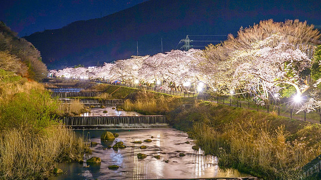 早川堤沿いの約120本のソメイヨシノの桜並木は、宮城野地区の桜の名所です。また、国道138号線沿いには、100本ほどのシダレザクラの並木があり、知る人ぞ知るお花見スポットです。桜の舞い散る幻想的な雰囲気の中、川のせせらぎを聞きながら散策を楽しむことできます。下記の日程でライトアップの点灯式イベントを開催予定です。昼間とは違った幻想的な桜並木をお楽しみいただけます。