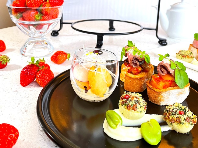 春のウエルカム・アフタヌーンティーは、福岡県のブランド苺「あまおう」をふんだんに。ムースに、ショコラに、クリームに、もちろんトッピングとして。The Onefiveオリジナル、2段目の創作和風洋菓子ではお餅の中にも隠れています。3段目のセイボリーは春らしい青みがいっぱい。お部屋が一気に春色に変わります。