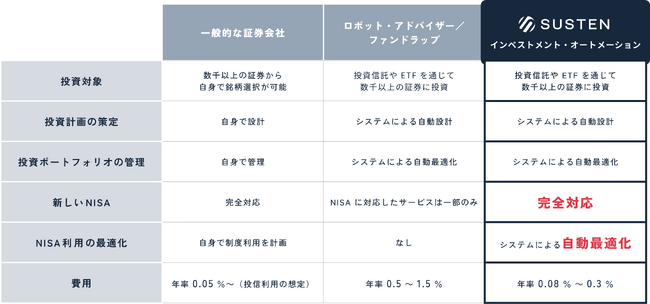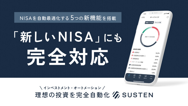 資産運用の自動化サービス『SUSTEN(サステン)』を提供する株式会社sustenキャピタル・マネジメント(サステン・キャピタル・マネジメント、本社:東京都港区、代表取締役: 岡野大・山口雅史)は、2024年からの新しいNISAに完全対応した『インベストメント・オートメーション』の提供を開始します。非課税枠の最適利用、 投信運用、積立投資、定額給付といった機能をすべて自動化し、一人ひとりに合った理想の資産運用ポートフォリオ構築のお手伝いをいたします。