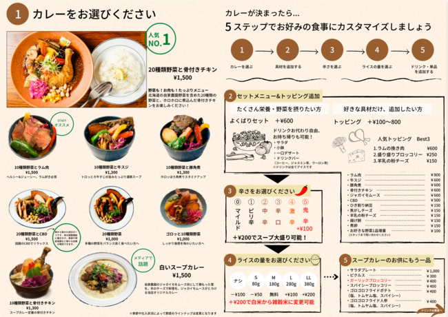 多種の野菜をバランス良く食べたい時には20種類野菜のスープカレー、しっかり食感を楽しみたい時にはゴロッと10種類野菜のスープカレーをお選びいただけるようになりました。その日の気分に合わせてお肉も楽しめるように、骨付きチキンや牛スジ、ラム肉など幅広く種類を揃えております。店内で出来立てはもちろん、テイクアウトやデリバリーサイトを通じてのご注文も受け付けております。