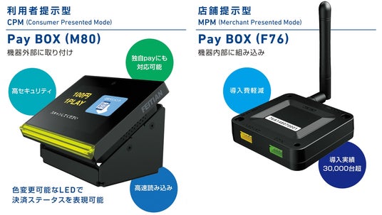 このたび新たに発売する「Pay BOX(M80)」は、CPM(Consumer Presented Mode:利用者提示型)方式に対応した新モデルで、利用者がスマートフォンのQRコードを端末にかざすだけで決済が完了します。端末は外付けタイプで、既存機器にも簡単に導入可能です。